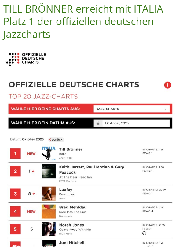 - TILL BRÖNNER erreicht mit ITALIA Platz 1 der offiziellen deutschen Jazzcharts