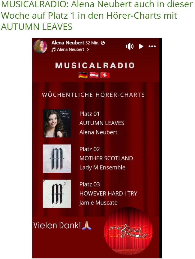 - MUSICALRADIO: Alena Neubert auch in dieser Woche auf Platz 1 in den Hörer-Charts mit AUTUMN LEAVES
