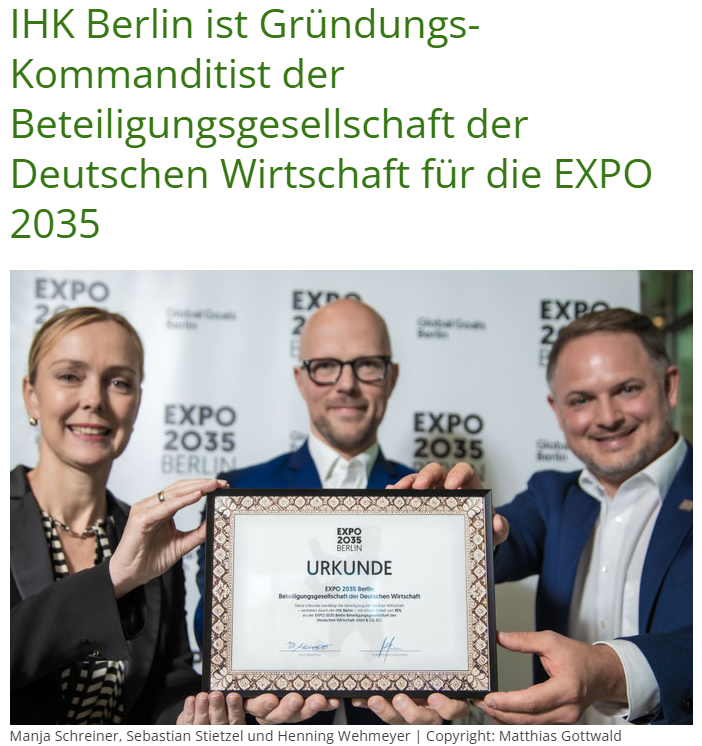 - IHK Berlin ist Gründungs-Kommanditist der Beteiligungsgesellschaft der Deutschen Wirtschaft für die EXPO 2035