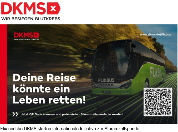 Unter dem Motto „Deine Reise könnte ein Leben retten“ machen Flix und die DKMS den Registrierungsprozess für die Stammzellspende so einfach wie möglich: Reisende, die das WLAN auf FlixBus- und FlixTrain-Fahrten in Deutschland oder im FlixBus in Polen, Chile, Großbritannien und den USA nutzen, werden auf eine spezielle Startseite weitergeleitet und können dort online sofort mit wenigen Klicks ein Registrierungsset der DKMS anfordern. Auch Indien ist Teil der Kampagne, dort sollen neben internen Registrierungsaktionen bei Flix auch weitere Awarenessaktionen geplant werden.