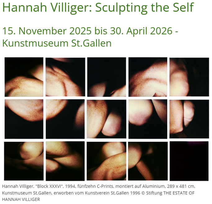 (St. Gallen / kmsg) - Das Kunstmuseum St.Gallen widmet der Schweizer Künstlerin Hannah Villiger (1951–1997) eine Kabinett-Ausstellung, die ihr innovatives, genreübergreifendes Werk im Bereich der künstlerischen Fotografie neu beleuchtet. Villiger, die insbesondere für ihre grossformatigen, häufig mehrteiligen, auf Polaroid-Aufnahmen basierenden Werke bekannt ist, bezeichnete sich als Bildhauerin, die Fotografie als ihr Hauptmedium verwendete. Ihr Werk, das zwischen Fotografie und Skulptur vermittelt, trug massgebend zur Erweiterung der Fotografie zu einem künstlerischen Medium bei. Die Kamera diente ihr in erster Linie als Mittel, die skulpturalen Eigenschaften eines fotografischen Subjekts zu erkunden und aus unterschiedlichen Perspektiven zu untersuchen.