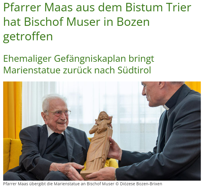 (Bozen/Merzig/Trier/bt) – Am Donnerstag, 21. August, hat Bischof Ivo Muser (Diözese Bozen-Brixen) Priester Josef Maas empfangen, der in den 1960er-Jahren als Gefängnisseelsorger in Mailand tätig war. Im Rahmen der Begegnung wurde dem Bischof eine Marienstatue überreicht, die Maas einst von Südtiroler Häftlingen erhalten hatte.