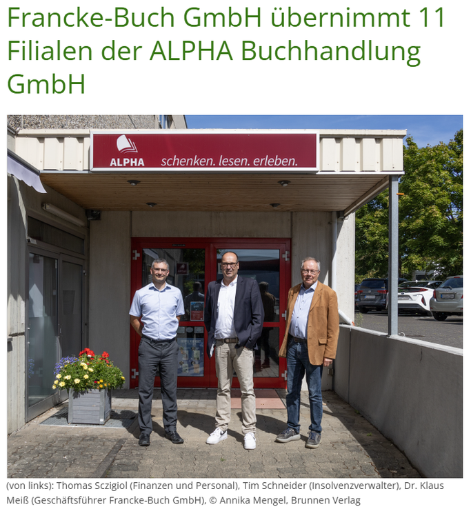 - Francke-Buch GmbH übernimmt 11 Filialen der ALPHA Buchhandlung GmbH