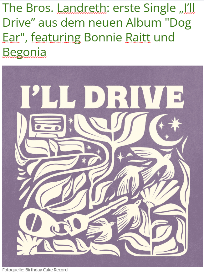 - The Bros. Landreth: erste Single „I’ll Drive” aus dem neuen Album "Dog Ear", featuring Bonnie Raitt und Begonia