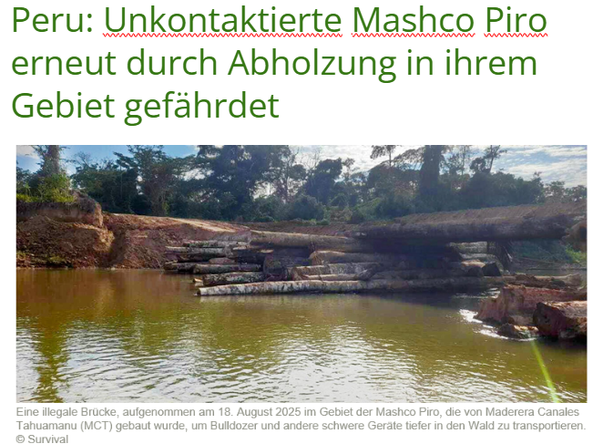 (London/si) - Eine indigene Yine-Gemeinschaft im peruanischen Amazonasgebiet berichtet, dass benachbarte Angehörige des unkontaktierten Volkes der Mashco Piro kürzlich in ihr Dorf gekommen sind, obwohl sie selten aus dem Wald hervorkommen. Der Zeitpunkt der Berichte ist bemerkenswert, da erst kürzlich die Abholzung in diesem Gebiet wieder aufgenommen wurde.