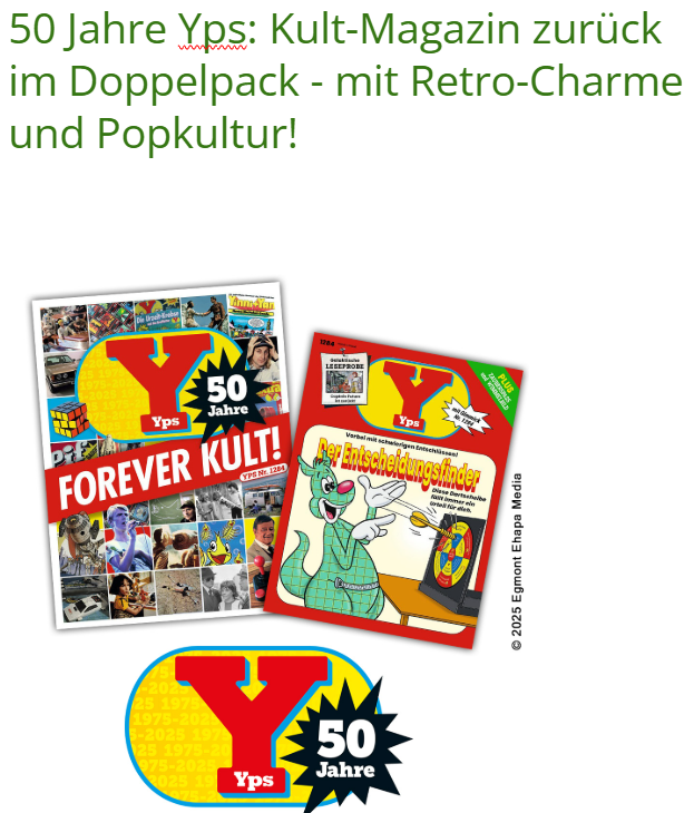 (Berlin/eem) - Egmont Ehapa Media bringt am 04. September 2025 das legendäre Kult-Magazin „Yps – mit Gimmick“ zurück an den Kiosk – und das gleich im Doppelpack! Ausgabe 1284 bietet zwei Hefte: Das erste entführt dich zurück in die 70er- und 80er-Jahre – in die Ära von Urzeitkrebsen, Solarzeppelin & Co. Serien, Filme, Comics, Hörspiele – wir feiern die Popkultur unserer Kindheit! Das zweite Heft kommt wie damals daher: mit Comics, Üps-Humor und allem, was man über den Kult-Gimmick wissen muss – die Überraschung, die Yps unsterblich machte! Dabei handelt es sich in dieser Ausgabe um einen Entscheidungsfinder, ein Dartspiel mit Magnetpfeilen.