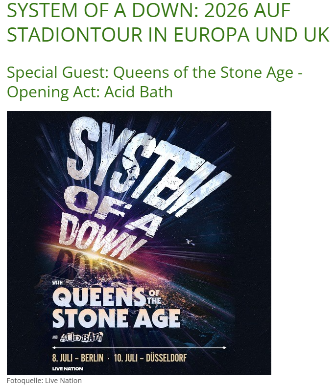 (Frankfurt/ln) - Nach dem überwältigenden Erfolg ihrer auf sechs Termine limitierten, restlos ausverkauften Stadiontour in Nordamerika diesen Sommer – sowie einer triumphalen, ausverkauften Stadiontour durch Lateinamerika Anfang des Jahres, bei der über 500.000 Tickets verkauft wurden – kündigen die GRAMMY®-ausgezeichneten Rock-Ikonen System Of A Down für den Sommer 2026 ihre große Rückkehr ins Vereinigte Königreich und Europa an: In Form einer Stadiontour.