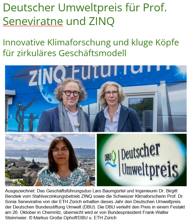 - Deutscher Umweltpreis für Prof. Seneviratne und ZINQ