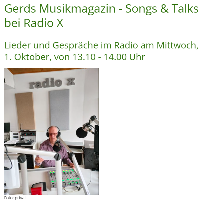 In seiner Sendung „Gerds Musikmagazin“ stellt Gerd Schwalm am Mittwoch, dem 1. Oktober 2025, von 13:10 – 14 Uhr bei Radio X Frankfurt wieder verschiedene Musizierende im Gespräch und musikalisch vor. Mit dabei sind: Felice, Jan Luley, die Ibo Knöpp Band, das Trio Fragment und Pauli.