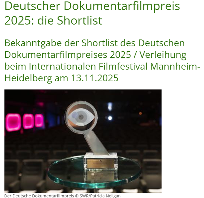 Bekanntgabe der Shortlist des Deutschen Dokumentarfilmpreises 2025 / Verleihung beim Internationalen Filmfestival Mannheim-Heidelberg am 13.11.2025