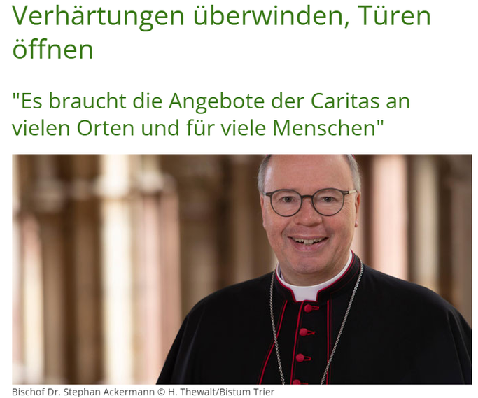 (Trier/Saarbrücken/Koblenz/sas) – „Die Öffnung der Heiligen Pforten in diesem Heiligen Jahr 2025 ist eine Aufforderung an uns alle, unsere Herzen zu öffnen, Verschlossenheit und Verhärtungen zu überwinden und Pilgerinnen und Pilger der Hoffnung zu sein.“ Das betont Bischof Dr. Stephan Ackermann in seinem Aufruf zum diesjährige Caritas-Sonntag am 21. September. Bischof Ackermann ruft gemeinsam mit den deutschen Bischöfen zur Kollekte für das katholische Hilfswerk auf. „Eine Spende für die Kollekte am Caritas-Sonntag hilft mit, dass die Türen der Caritas offengehalten werden können, dass Menschen in Not hinter diesen offenen Türen wirksame Hilfsangebote finden.”