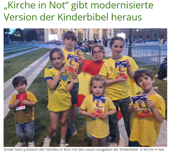 Der Papst bringt seinen Wunsch zum Ausdruck, dass „das Wort Gottes durch diese Bibel“ zu Kindern in aller Welt gelangt, „damit ihr Jesus immer besser kennenlernt und er euch hilft, im Glauben zu wachsen“. Der internationale Kirchliche Assistent von „Kirche in Not“, Pater Anton Lässer, hatte Leo XIV. ein Exemplar der neuen Kinderbibel beim Jubiläum der Familien Ende Mai in Rom überreicht.
