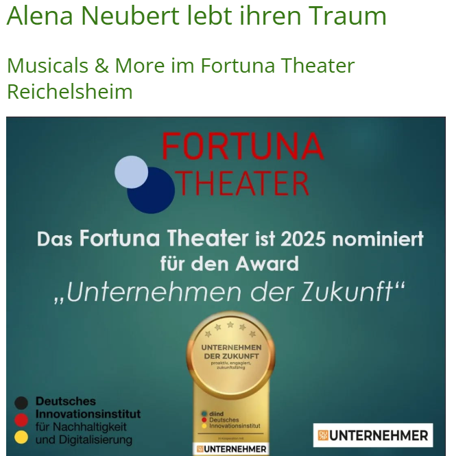 - Das Fortuna Theater in Reichelsheim wurde 2025 vom Deutschen Innovationsinstitut in Kooperation mit drm DUP Unternehmer-Magazin für den Award "Unternehmen der Zukunft"nominiert!