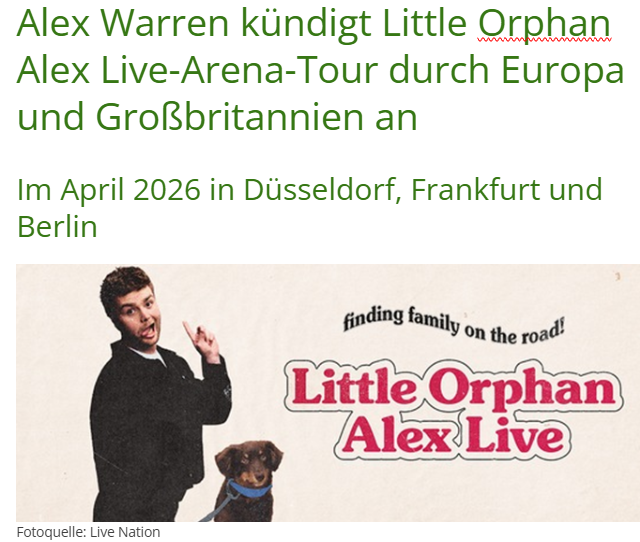 (Frankfurt/ln) - Chartstürmer und Singer-Songwriter Alex Warren hat heute neue Termine für seine Tournee Little Orphan Alex Live für Europa und Großbritannien bekanntgegeben. Die neue Konzertreise startet im April 2026 und Warren wird zum ersten Mal in Übersee als Headliner in Arenen auftreten. Beginnend in Düsseldorf führt es Warren in weitere große Städte wie Dublin, Amsterdam und Paris sowie in die legendäre O2 Arena in London. In Deutschland wird er im April 2026 neben Düsseldorf auch in Frankfurt und Berlin spielen.