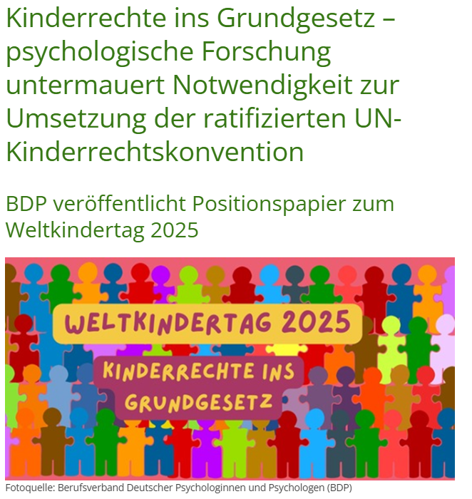 (Berlin/bdp) - Die Verankerung von Kinderrechten im Grundgesetz ist überfällig und die psychologische Forschung zeigt eindeutig: Kinder profitieren in ihrer psychischen, sozialen und kognitiven Entwicklung, wenn ihre Rechte systematisch anerkannt und strukturell gesichert sind. Zum Weltkindertag 2025 unter dem Motto „Kinderrechte – Bausteine für die Demokratie!“ veröffentlicht der Berufsverband Deutscher Psychologinnen und Psychologen (BDP) ein Positionspapier und fordert „Kinderrechte ins Grundgesetz“, denn es braucht einen klaren verfassungsrechtlichen Rahmen, um die Rechte von Kindern auf Schutz, Förderung und Beteiligung nach Artikel 3 der UN-Kinderrechtskonvention nachhaltig zu stärken, die seit 1992 auch in Deutschland gelten.