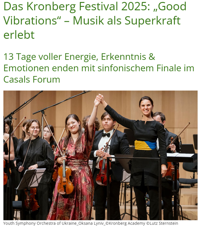 (Kronberg im Taunus/ka) - Nach 13 Tagen voller musikalischer Höhepunkte ging am Sonntag das Kronberg Festival 2025 mit zwei ausverkauften Sinfoniekonzerten zu Ende. Unter dem Motto „Good Vibrations“ feierte es die Musik als „Superkraft“: nicht nur als inspirierendes Erlebnis, sondern auch Quelle von Gesundheit und lebensverändernder Energie. Mehr als 30 hochkarätig besetzte Konzerte wurden ergänzt durch Vorträge, Workshops und Formate, die zum Mitmachen einluden. Zugleich fanden Geigen- & Bratschen-Meisterkurse statt, zu denen rund 250 junge Musikerinnen und Musiker aus 40 Nationen angereist waren.