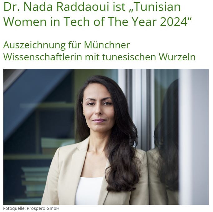 (München/pr) - Die Münchner Wissenschaftlerin und Unternehmerin Dr. Nada Raddaoui erhält den Wissenschaftspreis „Tunisian Women in Tech of The Year 2024“ der internationalen Förderorganisation Tunisian AI Society. Die Auszeichnung als „Tunisian Women in Tech of The Year“ würdigt die herausragende Forschungsarbeit der in Gafsa/Tunesien geborenen und heute in München tätigen Naturwissenschaftlerin Dr. Nada Raddaoui. Vergeben wird der Preis von der Tunisian AI Society – einer Organisation, die sich der Förderung von künstlicher Intelligenz in Tunesien widmet, – in Kooperation mit dem in Frankreich ansässigen Verein „Reconnectt“. Die Verleihung findet am 18. November 2025 im tunesischen Sousse statt. Tunesische Wurzeln, deutsche Exzellenz Raddaoui ist eine von insgesamt fünf Preisträgerinnen mit tunesischen Wurzeln, die in diesem Jahr für Spitzenleistungen in den Sparten Wissenschaft, Forschung und technische Entwicklung ausgezeichnet werden. Auf wissenschaftlicher Ebene ist die promovierte Biologin, Unternehmerin sowie Geschäftsführerin des Cluster for Nucleic Acid Therapeutics Munich (CNATM) bekannt für ihre Arbeit auf dem Gebiet der Nukleinsäure-basierten Therapien und Diagnostik – ein Bereich, der neue Möglichkeiten zur Behandlung zahlreicher Krankheiten eröffnet. Im Zuge ihrer Forschungsarbeiten entwickelte sie eine neuartige Methode zur Diagnose von Leukämie, für die sie bereits 2021 den internationalen Preis „Monte Carlo Women of the Year“ erhielt.