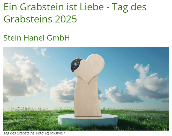 (Leutershausen/ots) - Am Samstag, den 18. Oktober 2025, rückt der bundesweite "Tag des Grabsteins" den Gedenkstein in den Mittelpunkt. Seit 2018 informiert der Aktionstag über Gestaltungsmöglichkeiten, Preise und die Geschichte des Grabmals - sowohl vor Ort beim Steinmetz als auch online. Das diesjährige Motto lautet: "Ein Grabstein ist Liebe".