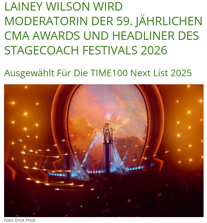 - LAINEY WILSON WIRD MODERATORIN DER 59. JÄHRLICHEN CMA AWARDS UND HEADLINER DES STAGECOACH FESTIVALS 2026