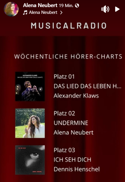 Ein großartig gesungener Song von Alena Neubert in einem phantastischen Konzert in Stockheim in der Kulturhalle. - Ich freue mich auf das Halleluja-Konzert im Fortuna Theater in Reichelsheim-Heuchelheim. - DANKE, Alena! - Gert Holle,, Herausgeber und leitender Redakteur von WIR IM NETZ - Kultur und Glaube Aktuell.