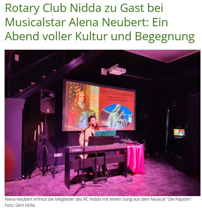 (Reichelsheim/Echzell/rcn) - Der Rotary Club Nidda erlebte kürzlich einen außergewöhnlichen Clubabend im Fortuna Theater in Reichelsheim. Gastgeberin war Alena Neubert, Musicaldarstellerin, Schauspielerin, Sängerin und Gründerin des Theaters.