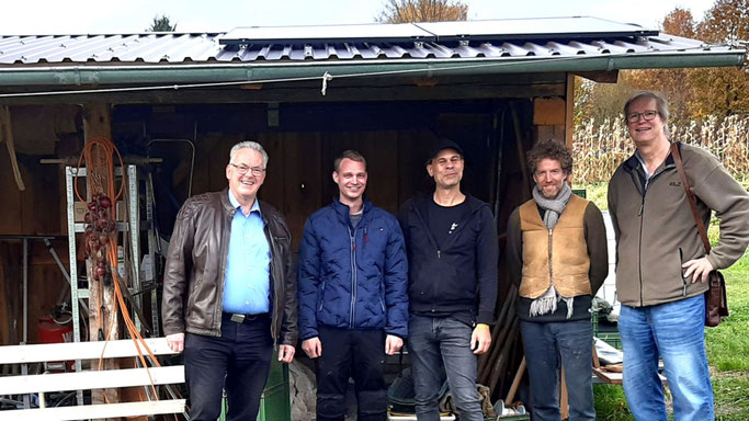 (Wallernhausen/Region/rcn) – Ein goldener Oktobernachmittag auf dem Bunten Acker: Zwischen Kohlreihen und winterfesten Beeten glitzern drei Solarpaneele in der Sonne. Neben dem kleinen Unterstand stehen Rotary-Präsident Fritz Hense, Vizepräsident Gert Holle, Gärtner Stefan Sylla, Vorstandsmitglied Till Strohbusch, Energieexperte Florian Appel aus Schotten sowie Christiane Rehahn, Vorsitzende der Solidarischen Landwirtschaft Wallernhausen. Gemeinsam begutachten sie, was durch bürgerschaftliches Engagement, technische Kreativität und viel Idealismus möglich wurde – eine neue Photovoltaikanlage, die künftig Wasserpumpe, Lastenrad und weitere Geräte der Solidarischen Landwirtschaft Wallernhausen mit sauberem Sonnenstrom versorgt.