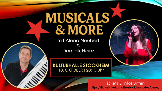 (Glauburg-Stockheim/gho) - Ein Abend voller Gänsehautmomente, brillanter Stimmen und zeitloser Musik erwartet die Besucher am 10. Oktober in der Kulturhalle Stockheim: Das Erfolgsprogramm „Musicals & More“ mit Alena Neubert und Dominik Heinz gastiert erstmals in der Region. Beginn ist um 20:15 Uhr (Einlass ab 19:45 Uhr).