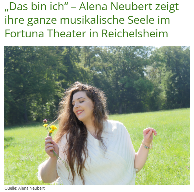 (Friedberg / Region / gho) - Mit ihrer warmen Stimme, ihrer Bühnenpräsenz und einer außergewöhnlichen Vielfalt hat sich Alena Neubert längst einen Namen in der regionalen Kulturszene gemacht. Nun geht die 29-jährige Friedbergerin einen Schritt weiter: Mit ihrem neuen Konzertprogramm „Das bin ich“ lädt sie am 27. September und am 18. Oktober, jeweils um 19 Uhr, ins Fortuna Theater in Reichelsheim-Heuchelheim ein – und verspricht nichts weniger als ihr persönlichstes Programm bisher.